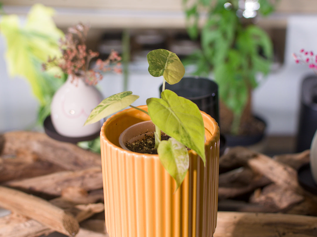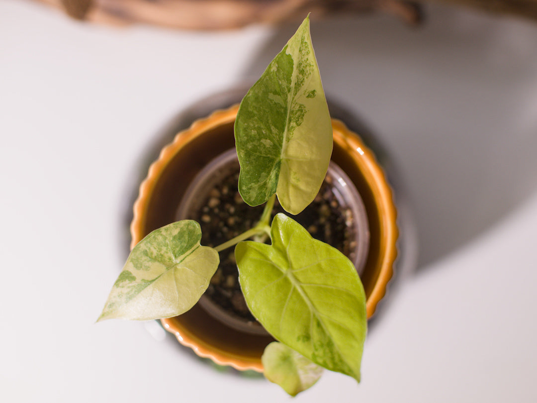 Belle Alocasia macrorrhizos Aurea, connue pour ses grandes feuilles vert clair à jaune, très lumineuses et graphiques.