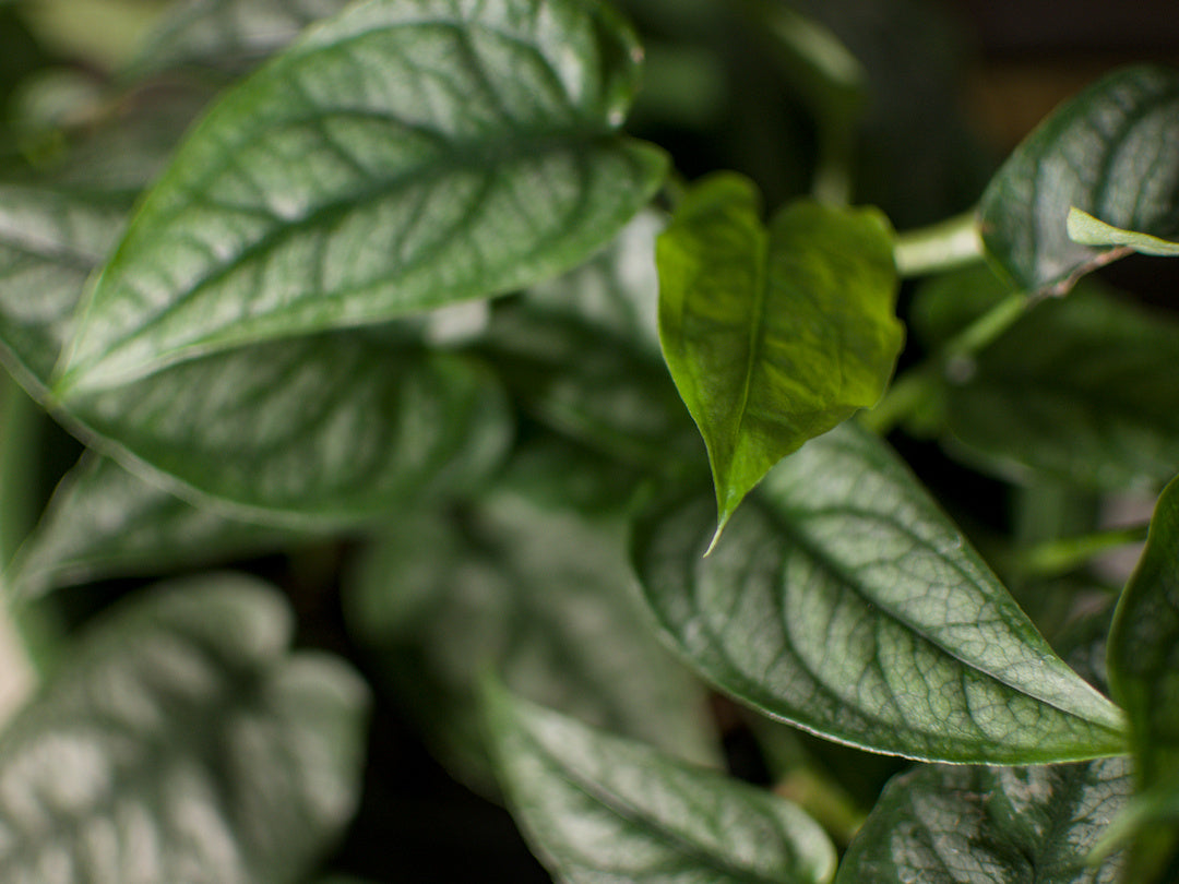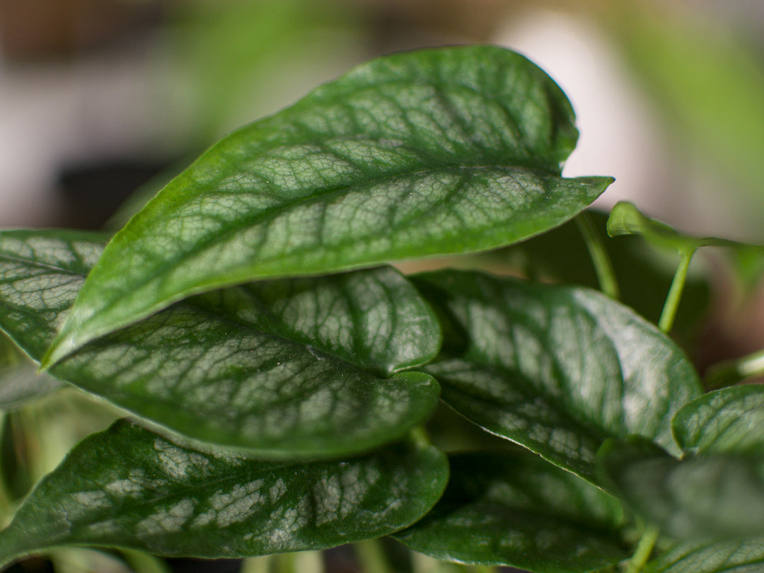 Feuillage : Feuilles argentées veinées de vert foncé, texture satinée